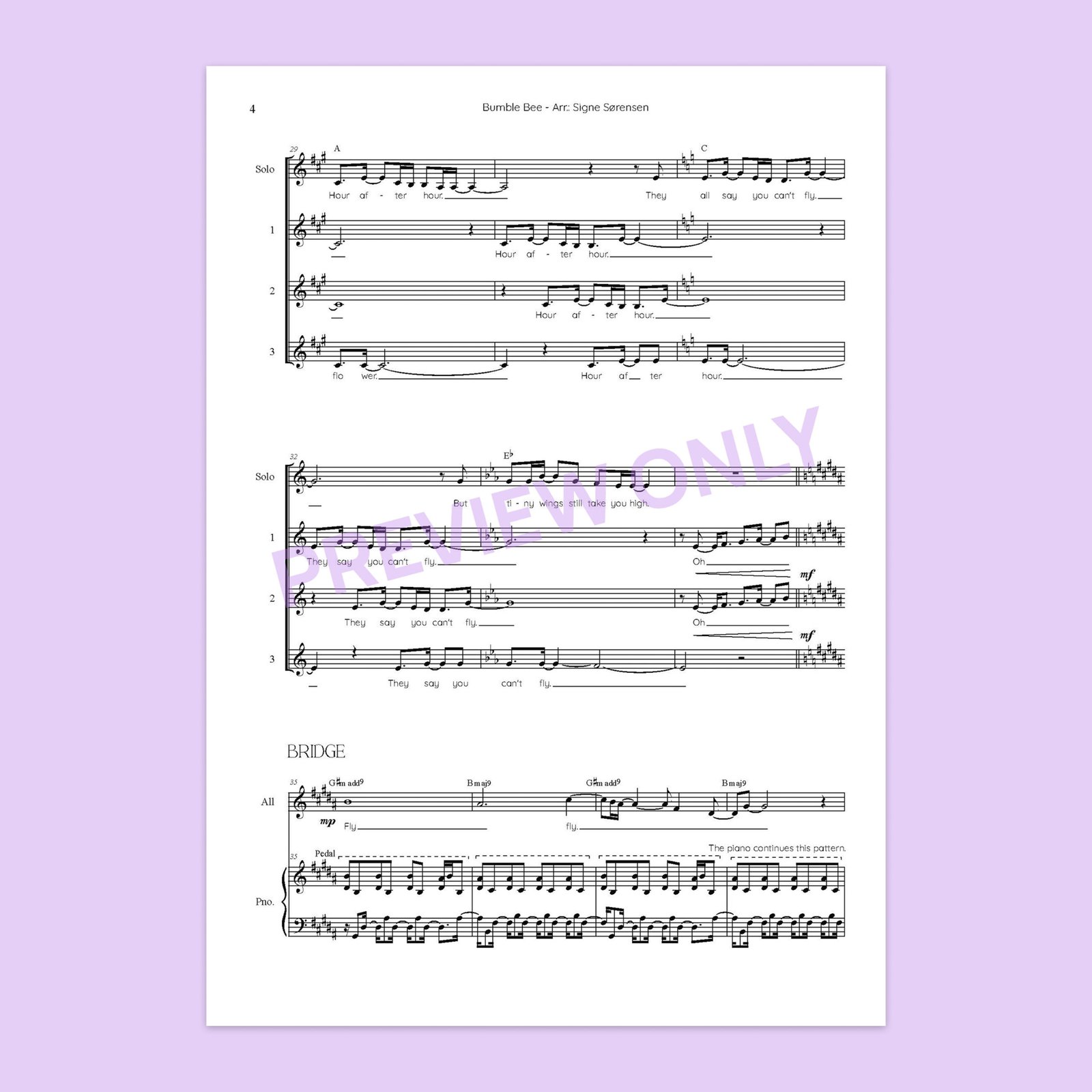 The arrangement is written for SSA + soloist (it works well with different soloists) and designed with respect for young singers’ abilities and limitations – especially regarding the repetitive ostinatos that underpin the melody in the original.