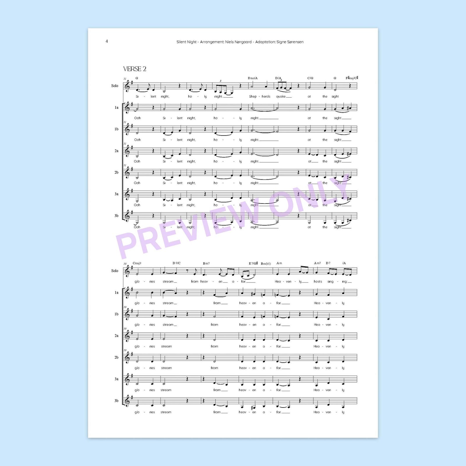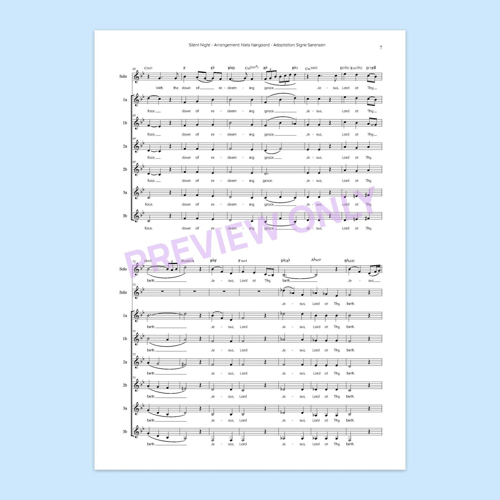 Adaptation of Niels Nørgaard’s wonderful arrangement of Silent Night. The arrangement is written for SSSAAA + soloist (preferably several different soloists) and is based on the arrangement Niels Nørgaard created for the vocal group Basix in 2005.